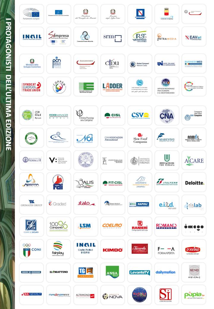 Il 6° CSRMed è organizzato in collaborazione con SI Impresa, Azienda Speciale della Camera di Commercio di Napoli/EEN Enterprise Europe Network, INAIL Campania, EAV-Ente Autonomo Volturno srl, Regione Campania-Sviluppo Campania-Fondazione Polis e Deloitte, con la partnership scientifica del Consorzio Promos Ricerche – Sportello RSI Camera di Commercio di Napoli e con il patrocinio del CESE-Comitato Economico e Sociale Europeo, Assemblea Parlamentare del Mediterraneo, Unioncamere Campania, Regione Campania, Camera di Commercio di Napoli, Comune di Napoli, Camera di Commercio Italo-Maltese.