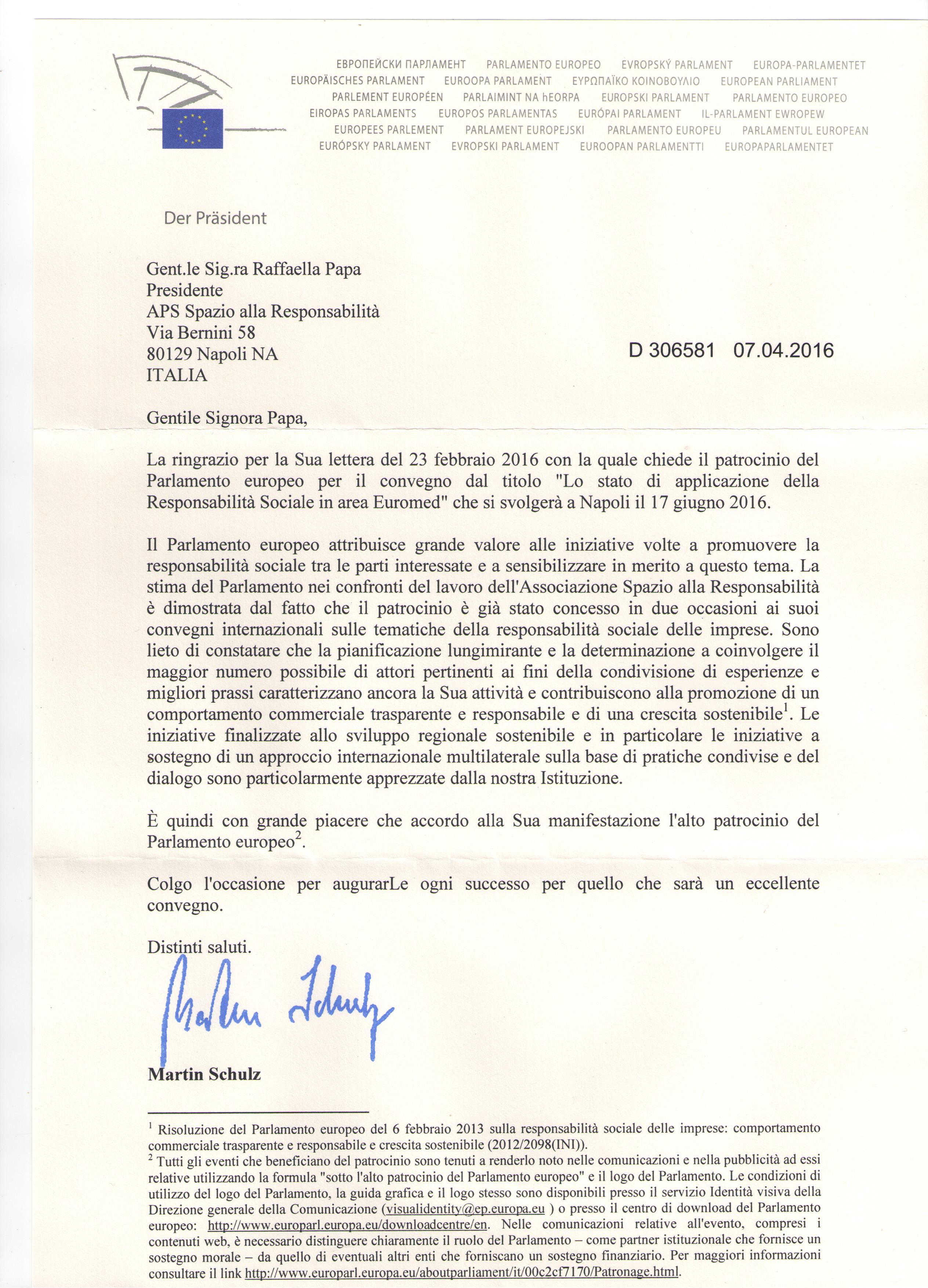 Condividiamo con tutti voi la soddisfazione provata per la comunicazione ricevuta dal Presidente del Parlamento Europeo in merito alla concessione dell'Alto Patrocinio per il 4° Salone Mediterraneo della Responsabilità Sociale Condivisa, in programma a Napoli, presso la Camera di Commercio Palazzo della Borsa, dal 16 al 18/06.