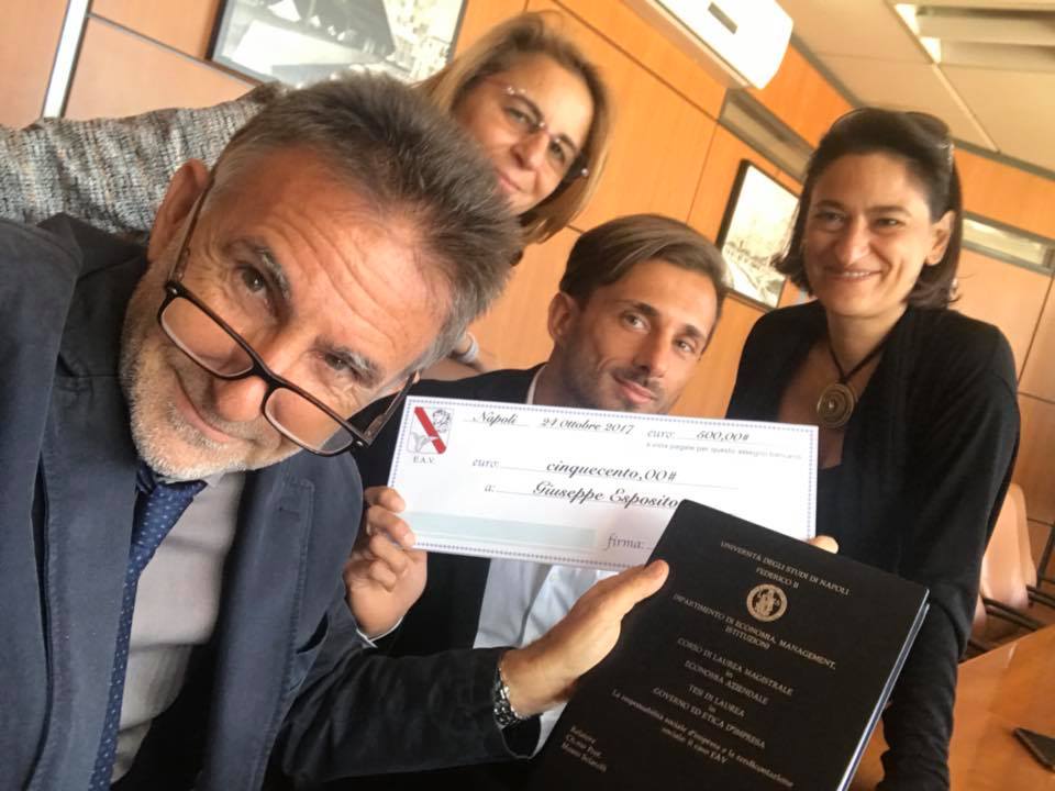 "Arrivare al bilancio sociale nel 2018 rappresenta un obiettivo che va inquadrato nel novero degli impegni dell'EAV di dare conto ai propri stakeholder dei risultati raggiunti e degli obiettivi prefissati per migliorare i propri impatti sull'ambiente ed il territorio-dichiara UDG, Presidente dell'EAV- Un processo articolato che necessita di nuove competenze e nuove figure professionali di accompagnamento e supporto alle imprese ed è per questo che abbiamo voluto riconoscere una borsa di studio non solo per il buon lavoro svolto ma anche come incoraggiamento a proseguire nella strada intrapresa."